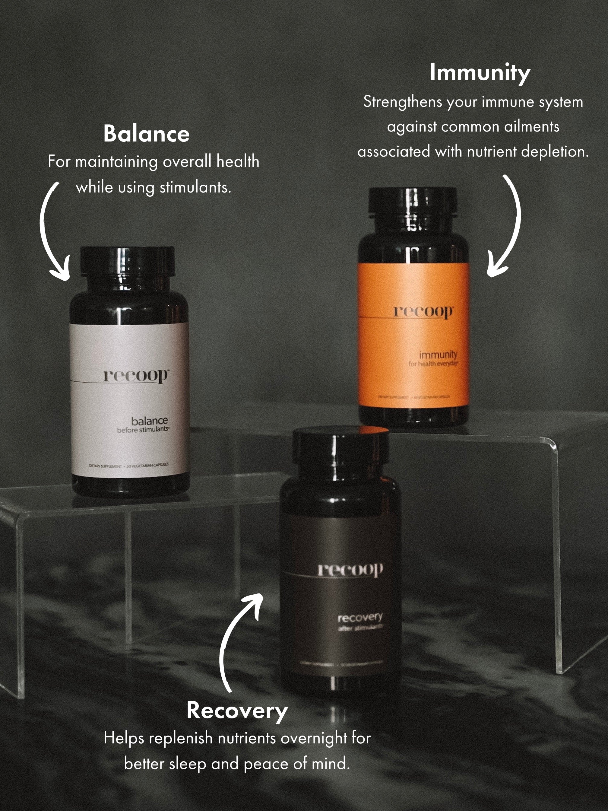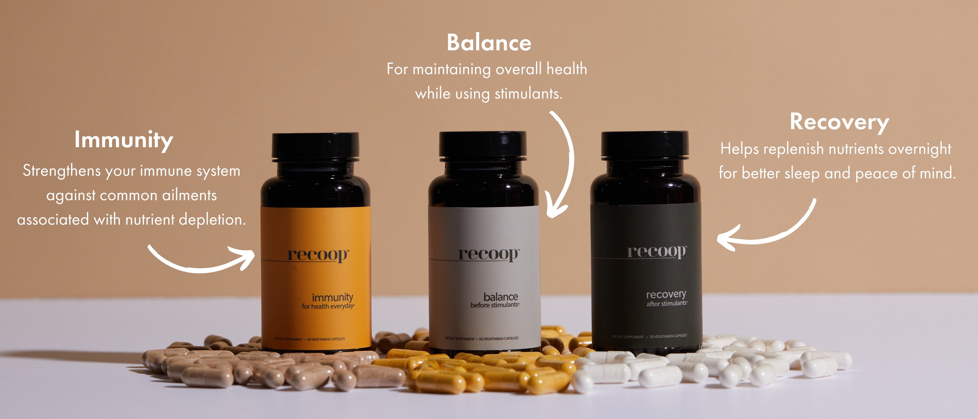 Recoop replenishes the nutrients that stimulants temporarily deplete from your body, helping support steadier tolerance over time.